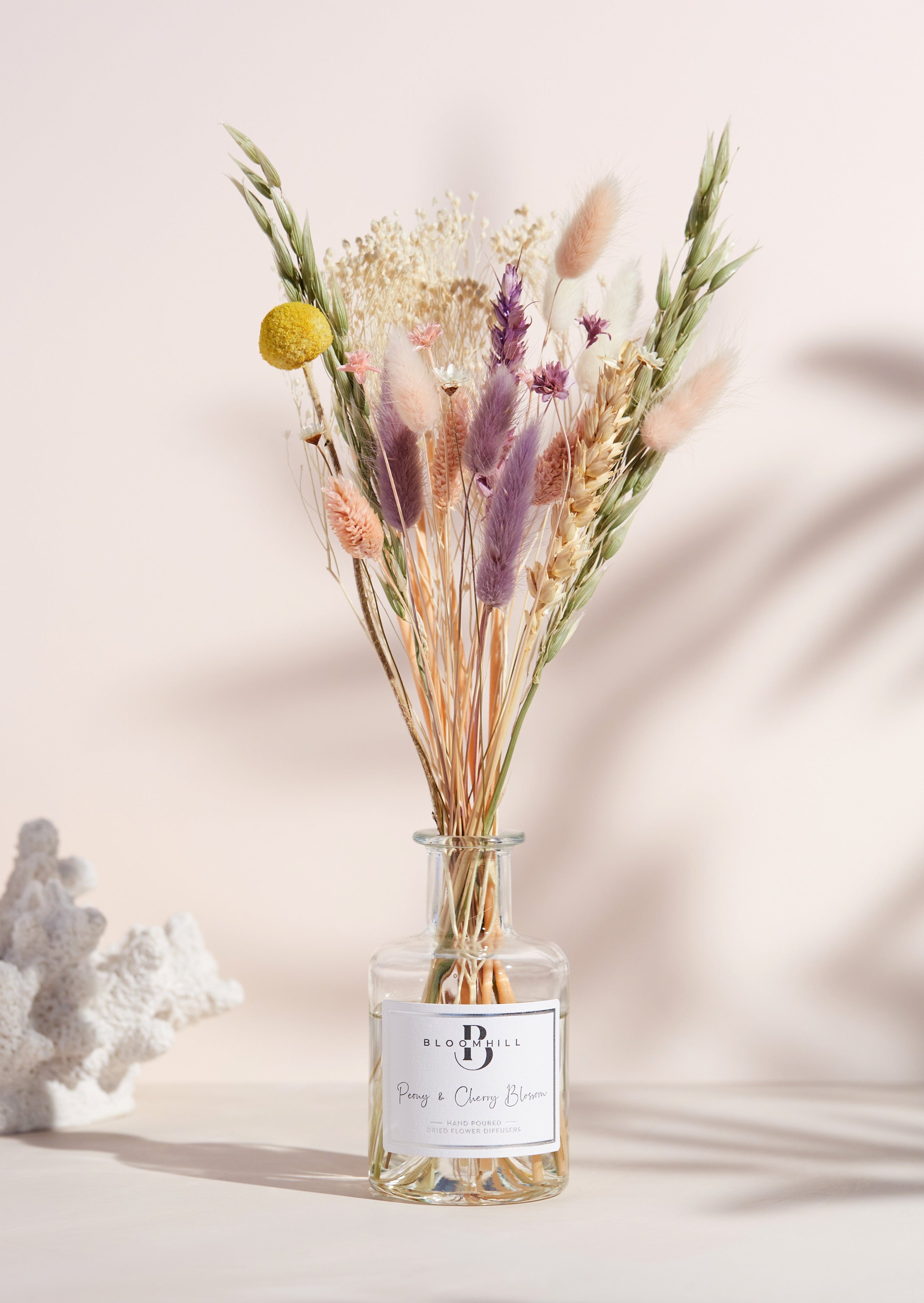A beautiful hand tied dried flower arrangement in gorgeous spring inspired shades. The magnificent Margot bouquet is it our biggest Bloomhill bouquet yet! The Margot is made up of on trend blush pink, white and lilac bunny tails, gorgeous green avena oats, delicate lilac and pink hill flowers, glixia flowers, pink canary grass, broom bloom, lilac and natural wheat and is finished with a pop of colour with our yellow billy button. Arranged with our signature Bloomhill fibre reeds diffuser sticks within the bouquet, hand tied to easily put straight into your Bloomhill diffuser vase.