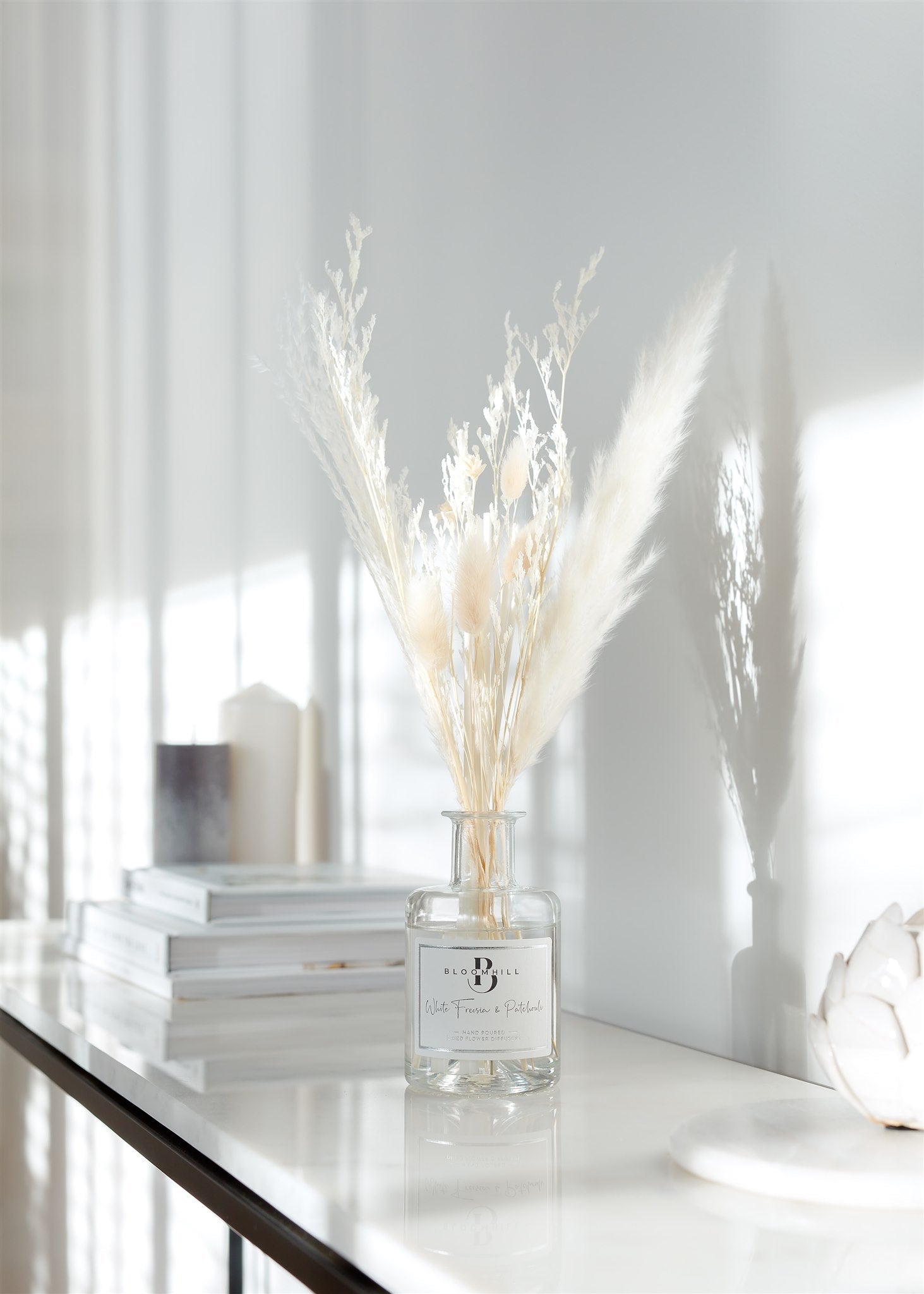 A beautiful hand tied dried flower arrangement in a gorgeous ivory white shade. The Olivia is made up of on trend bunny tails, hill flowers, prarie grass and fluffy pampas. Arranged with our signature Bloomhill fibre reed diffuser sticks within the bouquet, hand tied to easily put straight into your Bloomhill diffuser vase.